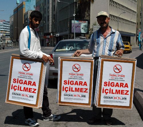poster satanlar şimdi sokakta üzerinde, "Yasal Uyarı, 4207 Sayılı Yasa gereğince bu alanda sigara içilmez. Cezası 69 TL.'dir." yazılı levhaları pazarlıyor.
