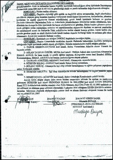 Terörle Mücadele Şubesi'nde şahitler önünde 07.01.1997 tarihinde verdiği 15 sayfalık ifadesinde Mustafa Duyar, her sayfaya tek tek imza attı. Duyar'ın 15 sayfada bulunan 15 imzası da birbirinin aynı. Bu imzalar Mustafa Duyar isminin el yazısıyla yazılmış biçimi şeklinde.