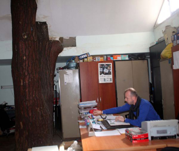 Düz Mahalle'de bulunan Zabıta Müdürlüğü'nün ve Belediye tarafından öğrencilerin faydalanması için kurulan İnternet Evi'nin hizmet verdiği tek katlı binanın içerisinden, iki gövdeli büyük çam ağacı çıkıyor. Belediye personeli ağacın bulunduğu odanın içerisinde hizmet verirken bu durumu görenler de şaşkınlığını gizleyemiyor.