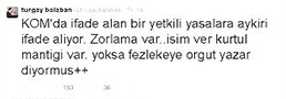 İfade alma işlemi sırasında KOM'un üst düzey yetkililerinden olan bir kişinin sorduğu soruların bir hukukçu olarak kendisinin bile kafasını karıştırdığını kaydeden Balaban, "İstihbaratçılıkta özel hayatın ihlali nasıl olur ki, kafamda deli sorular." dedi. Yine aynı yetkilinin ifade alma işlemi sırasında yasalara aykırı davrandığının altını çizen Balaban, "İfade alan bir yetkili, yasalara aykırı davranıyor. Zorlama var. 'İsim ver kurtul' mantığı var. 'Yoksa fezlekeye örgüt yazılır' diyormuş. Bu yetkili, KOM'da önemli bir kişi. Zamanı geldiğinde bu yetkilinin ismini kamuoyuna açıklayacağım." sözlerini kullandı.