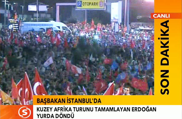 Akşam saatlerinde 50-60 kişi ile başlayan kalabalık ilerleyen vakitte giderek arttı. Havalimanında toplanan vatandaşlar Başbakan lehine sloganlar atıp sevinç gösterisinde bulundu.