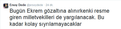 Dede, Ekrem Dumanlı'ya destek için yanında bulunan vekillere atıfta bulunarak "Bugün Ekrem gözaltına alınırkenki resme giren milletvekilleri de yargılanacak. Bu kadar kolay sıyrılamayacaklar'' ifadelerini kullandı.
