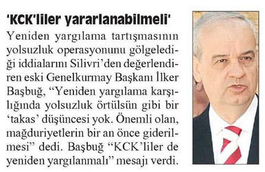 “Balyoz ve Ergenekon davaları üzerinden yürüyen ‘yeniden yargılama’ konusunun KCK yargılamalarını da kapsayıp kapsamaması konusunda ise şöyle düşünüyor: ‘Eğer yeniden yargılama olacaksa ‘Bana olsun, ona olmasın’ diyemeyiz. ÖYM’ler kalktığında bu antidemokratik mahkemelerin elindeki tüm dosyalar genel yargıya gitmelidir.’ ”