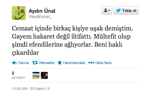 Başbakanlık Başmüşaviri Aydın Ünal, (@aydinunal_), yazdıkları ile twitter'da hizmet hareketine gönül verenleri inciten ifadeler kullanıyor.