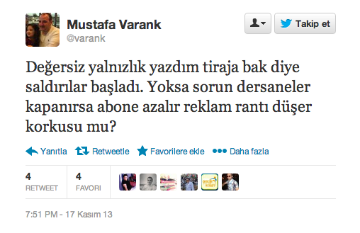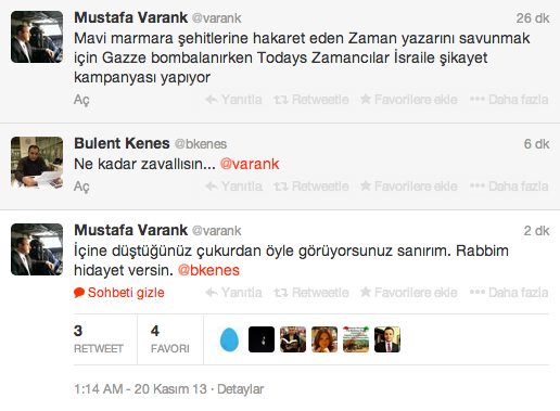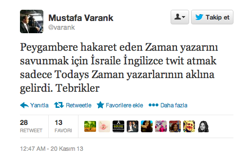 Bugün itibariyle hesabını dışarıya kapatan Varank, Today's Zaman'a ve gazetenin Genel Yayın Yönetmeni Bülent Keneş'e de hakaret etmekten çekinmiyor.