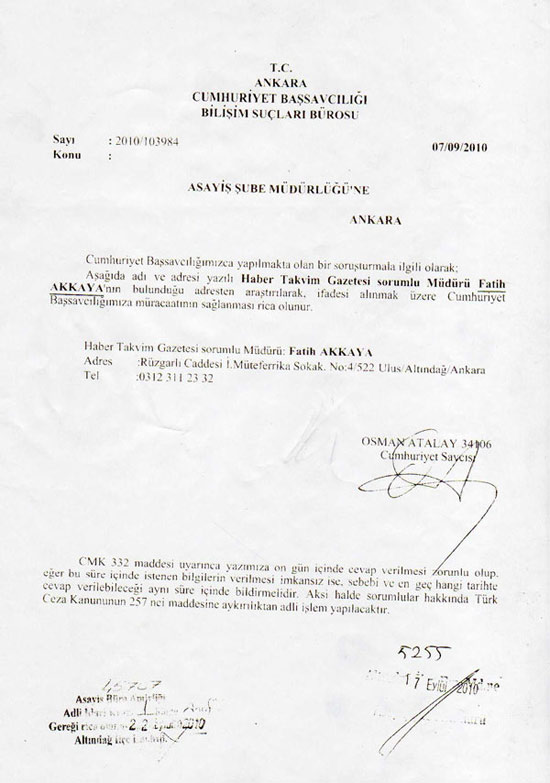 Takvim Gazetesi sorumlu Müdürü Fatih Akkaya'nın bulunduğu adresten araştırılarak, ifadesi alınmak üzere Cumhuriyet Başsavcılığımıza müracaatının sağlanması rica olunur. …Aksi halde sorumlular hakkında Türk