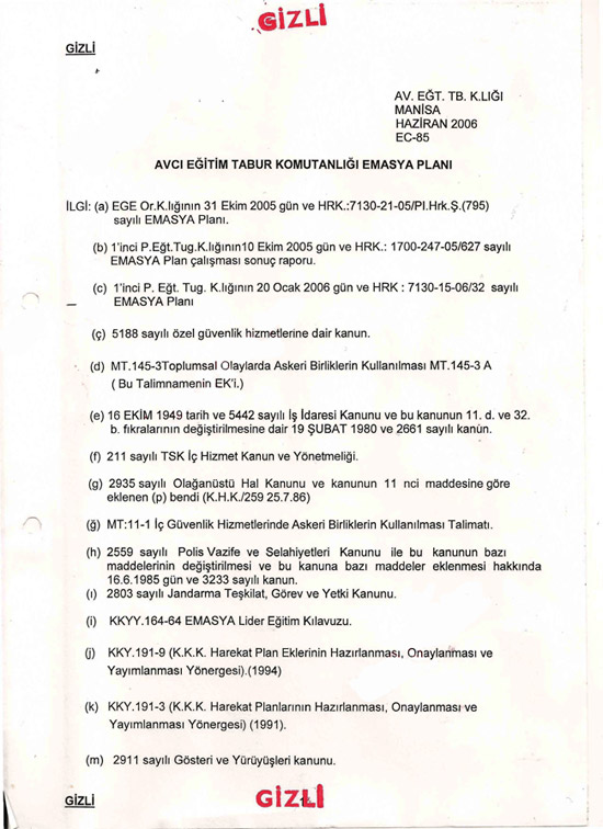 Ertuğrul Candanın imzası yer aldı. Avcı Eğitim Tabur Komutanlığının 19 Haziran 2006 tarihli ilgi yazısına atıf yapılan üst yazıda bölüklere şu talimat verildi: "Av. Eğt. Tb. Kliği (2'nci EMASYA Brl.K.lığı) EMASYA Planı hazırlanarak EK-A'da gönderilmiştir. EMASYA Bölüklerinin kendi EMASYA planlarını hazırlayarak onaylanmak üzere 15
