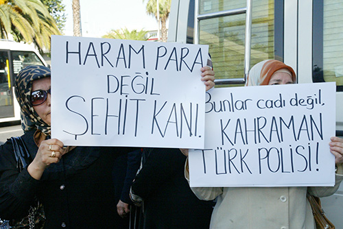İstanbul Emniyet’in önünde toplanan polis yakınları 'Bunlar cadı değil, Türk polisi', 'Haram para değil, şehit kanı', 'Hiç çalanla çalmayan bir olur mu', 'Devlet terbiyesi almış vatan evlatları gözaltı değil baş üstü' gibi pankartlar taşıdı. Grup daha sonra olaysız dağıldı.