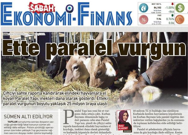 "Ette Paralel Vurgun" başlığı ile yarım sayfadan fazla yer ayrılan haberde sözde "Paralel Yapı" inekleri dana göstererek ette vurgun yapmış... Amaç da ithalatı açtırmakmış...