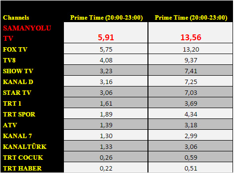 Samanyolu Tv,  kasım ayı genelinde de Prime Time'da en çok izlenen 5. kanal oldu.