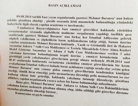 İstanbul Cumhuriyet Başsavcısı Hadi Salihoğlu, "Mehmet Baransu hakkında Adana ve Ankara'da 3 ayrı yakalama kararı bulunduğu için İstanbul Adliyesi önündeki basın açıklaması sırasında gözaltına alınmıştır" dedi.