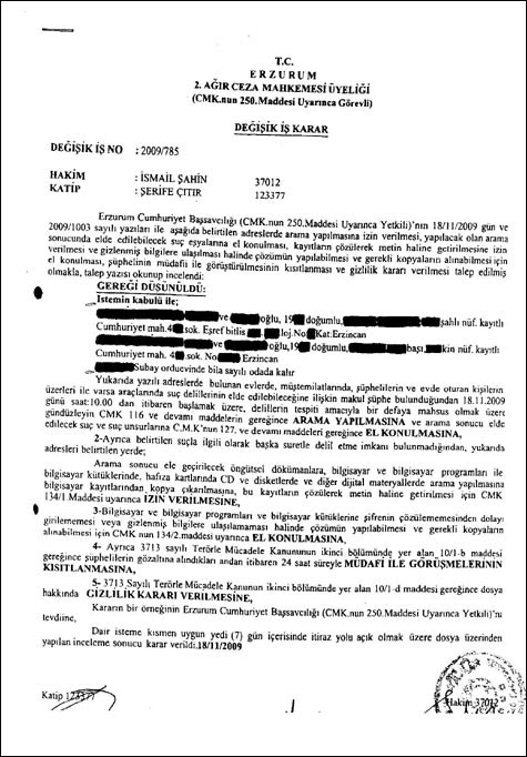 delil karartma durumunun önüne geçilmesi açısından isim ve adreslerin üzeri kapatılarak, Cumhuriyet Başsavcılığımızca (CMK'nın 250. Maddesi ile Yetkili Görevli) 18.11.2009 saat 11.34'te, kurumlar arası çatışmaya sebebiyet vermemek ve ilgili makamın nezaketen bilgilendirilmesine yönelik olarak,