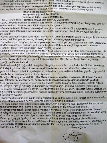 Çoban, söz konusu bildiriye insanlara yapılan haksızlıklara, kötülüklere tepki olsun diye kişisel fikirlerini yazdığını söyledi. Yazdıklarının hakaret değil kişisel tepki olduğunu iddia eden Çoban, "Ben kimseye hakaret etmem. Tüm insanları severim. Ben kişisel tepkimi dile getirdim ve insanlarla bu tepkilerimi paylaşmak için bu yazıyı yazdım. Kimseden korkum yok benim. İsterseniz beni savcılığa da şikâyet edin." dedi.