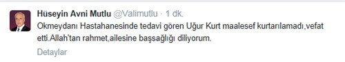 İstanbul Valisi Hüseyin Avni Mutlu, acı haberi Twitter hesabı üzerinden duyurdu. Mutlu'nun tweeti şöyle:
