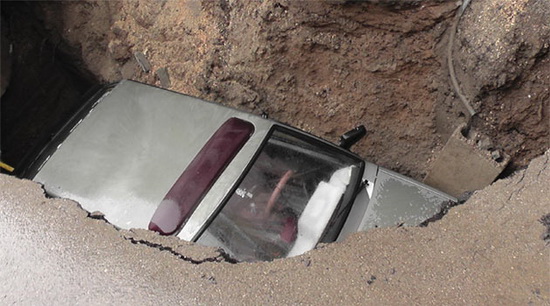 asfalt bir anda büyük bir gürültüyle çöktü. Çökmenin ardından 3 adet otomobin içine sığabileceği çapta bir çukur oluştu. Çökmenin etkisiyle park halindeki iki otomobil 6 metre derinliğe ulaşan çukurun içine düştü. Bir otomobil tamamen göçüğün altında kaldı. Çukura düşen arabalar bölgeden geçmekte olan doğalgaz borusunu da deldi.