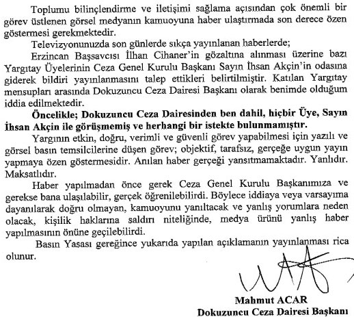 Bu haberde geçen iddialar üzerine Yargıtay 9. Ceza Dairesi Başkanı Mahmut Acar bir açıklama yaptı. İşte o açıklama: