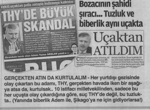 Son dönemlerde yaptığı haberlerle aklın sınırlarını zorlayan Yeni Akit, arşiv köşesinde skandal ifadelere yer verdi. THY tarafından Chicago uçağından polis zoruyla indirilen Muhammed Çetin’le ilgili haberleri veren gazete kupürlerinin altına “Gerçekten atın da kurtulalım” ifadelerini kullandı.