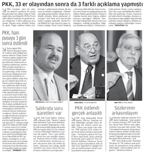 33 er olayı gibi soruşturulmasını isteyen eski bir siyasetçinin sözleri manşetteydi. PKK'nın saldırıyı üstlendiği haberi ise aynı sayfanın dibinde tek sütunluk bir haber olarak veriliyordu. AKP'li Hüseyin Çelik'in "Saldırıda soru işaretleri var" sözleri de eski tezde ısrarın bir başka göstergesiydi. "