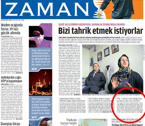Mehmet Yılmaz ya Zaman'ı eline almadan bunları yazdı. Veya (Ki daha vahimi) baktığı halde o haberi görmedi. Her iki halde de Amiral gemisi geçinen bir gazete için özür gerektiren ve aynı zamanda mahcup edici bir yazı. Çünkü o haber Zaman'ın hem taşra hem şehir baskılarında 1. sayfada vardı. Üstelik manşet haberin önemli ayaklarından biri olarak verilmişti. İç sayfalarda da PKK'nın açıklaması (