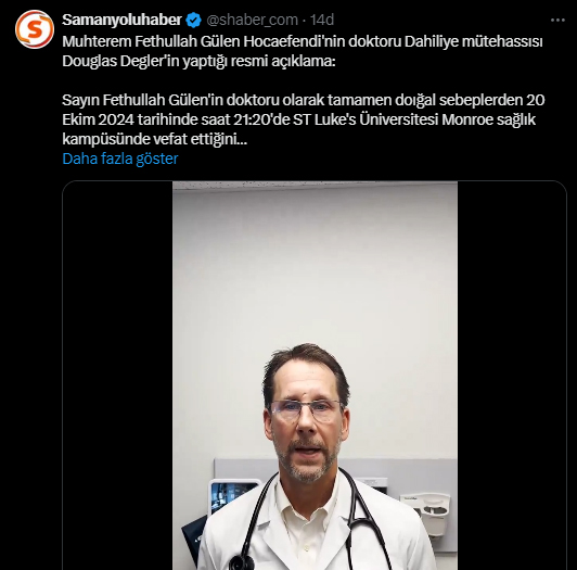 Hocaefendi'nin doktoru Degler "Sayın Fethullah Gülen'in doktoru olarak tamamen doğal sebeplerden 20 Ekim 2024 tarihinde saat 21:20'de ST Luke's Üniversitesi Monroe sağlık kampüsünde vefat ettiğini bildirmek istiyorum.