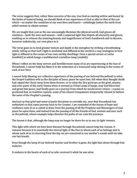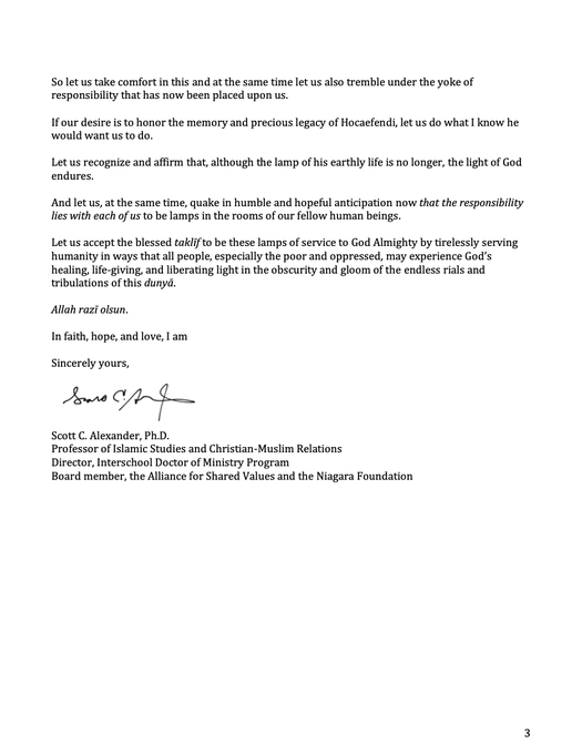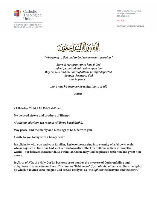 Sizlerle ve ailelerinizle dayanışma içinde, zamanın içindeki yolculuğu milyonlarca insanın hayatını dönüştüren bir etki yaratan yol arkadaşımız, sevgili Hocaefendi'miz M. Fethullah Gülen’in ebediyete intikalinin üzüntüsünü yaşıyorum; Allah ondan razı olsun ve ona merhamet etsin.