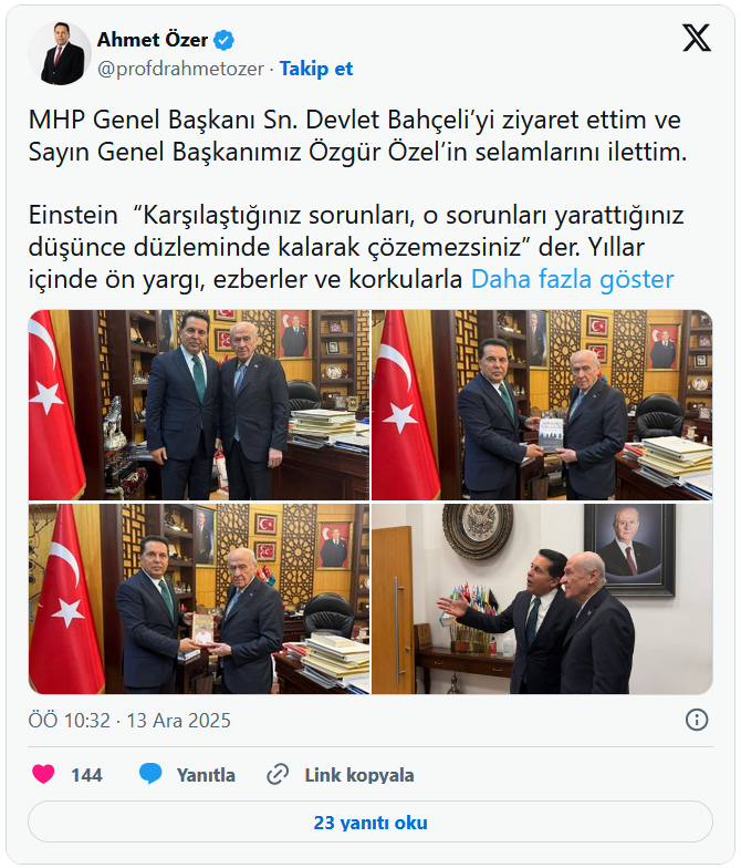 Devlet Bahçeli ile görüşmelerini sosyal medya hesabından yapmış olduğu paylaşımla duyuran Özer, “MHP Genel Başkanı Sn. Devlet Bahçeli’yi ziyaret ettim ve Sayın Genel Başkanımız Özgür Özel’in selamlarını ilettim” ifadelerini kullandı.