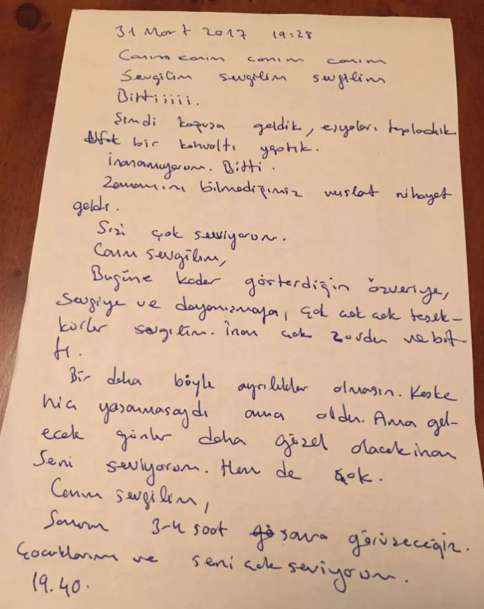 Murat Aksoy saat 19:28’de başlayıp 19:40’da bitirdiğini not düştüğü mektubunda, eşine seslenirken, ‘Canım Sevgilim, inanamıyorum ama bitti… İnan çok zordu ve bitti. Bir daha böyle ayrılıklar olmasın…’ ifadelerini kullanmış.
