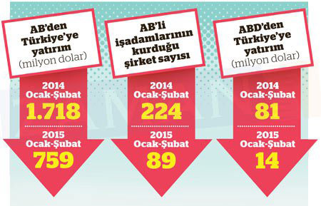 Hukuksuzluğun iş dünyasına sıçraması ve Şirketlere vergi baskısı, ekonomi için hayati öneme sahip yabancı yatırımlara büyük darbe vurdu. AB ülkelerinden gelen doğrudan yabancı yatırım 2011’de 11,5 milyar dolarken geçen sene 5,5 milyara geriledi. Düşüş, 2015’te daha da hızlandı. Ekonomi Bakanlığı ve Merkez Bankası verilerine göre, geçen yılın ocak ve şubat aylarında 1 milyar 718 milyon dolar olan AB’den doğrudan yatırım girişi, bu yılın aynı döneminde 759 milyona geriledi. Avrupalıların kurduğu şirket sayısı 224’ten 89’a düştü. 2011’de 1,4 milyar dolarla zirve yapan ABD’lilerin Türkiye’ye yatırımı geçen yıl 325 milyona indi. Bu yılın ilk iki ayında ise sadece 14 milyon dolar oldu. Oysa geçen yılın aynı döneminde 81 milyon dolardı.
