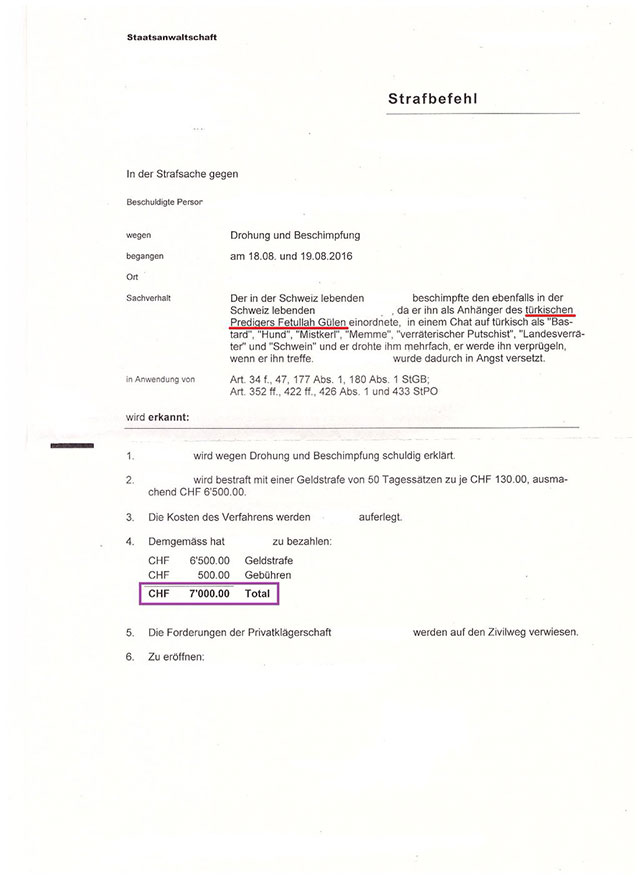 İsviçre'de yaşayan Hizmet gönüllüsü bir kişiye sosyal medya üzerinden hakaret ve tehdit mesajı yazan AKP'li 7000 Frank para cezasına çarptırıldı.