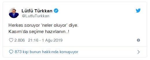 Türkkan sosyal medya hesabından yaptığı paylaşımda, "Herkes soruyor neler oluyor? diye. Kasımda seçime hazırlanın." değerlendirmesinde bulundu.