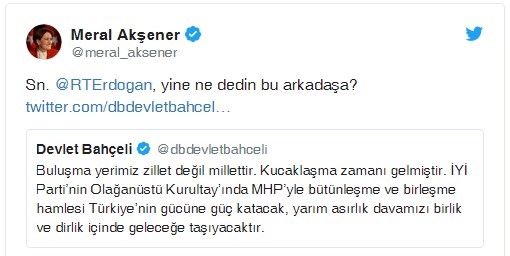 İyi Parti Genel Başkanı Meral Akşener de daha sonra yaptığı paylaşımda Bahçeli'nin mesajını alıntılayarak Erdoğan'ı etiketlediği mesajında, "Sayın Erdoğan yine ne dedin bu arkadaşa?" sorusunu yöneltti.