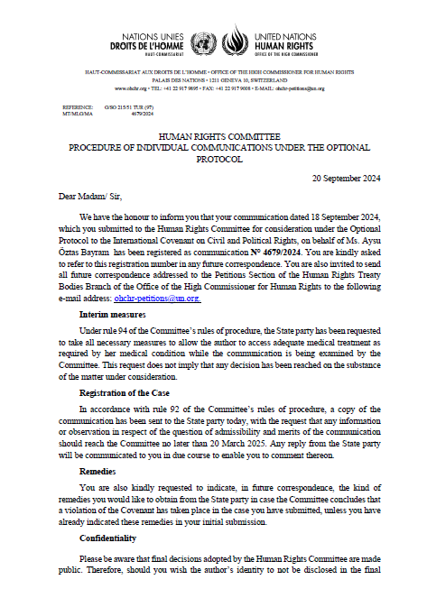 İnsan Hakları Komitesi ayrıca durumun aciliyetine binaen tedbir kararı vererek, Türkiye’den Aysu Öztaş Bayram’a tıbbi durumuna uygun olarak gerekli tedavinin sağlanmasına hükmetti.” ifadelerini kullandı.