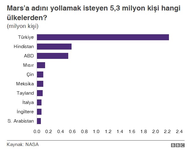 Kurumun, 'Mars'a adınızı gönderin' çağrısına şimdiye kadar büyük bir çoğunluğu Türkiye'den olmak üzere, 5 milyon 300 binden fazla kişi yanıt verdi.