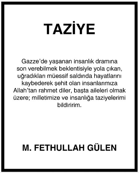 Akit, bugün sürmanşetten "Gülen: Katledilen 9 Türk şehid değil!" başlıklı bir haber yayımladı. Oysa ki bu yalan haberi kaleme alan Akit çalışanları Zaman gazetesinin Mavi Marmara saldırısı sonrası sayfalarına göz gezdirme zahmetinde bulunsalar olayın düşündükleri gibi olmadığını göreceklerdi. Çünkü Mavi Marmara olayından birkaç gün sonra Hocaefendi, 4 Haziran 2010 tarihli Zaman gazetesinde vefat eden insanlar için bir taziye mesajı yayımlıyor ve "Gazze'de yaşanan insanlık dramına son verebilmek beklentisiyle yola çıkan, uğradıkları müessif saldırıda hayatlarını kaybederek şehit olan insanlarımıza Allah'tan rahmet diler, başta aileleri olmak üzere; milletimize ve insanlığa taziyelerimi bildiririm..." diyordu.