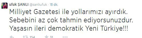 Ufuk Şanlı,konuyla ilgili twitter hesabından yaptığı açıklamada; "Milliyet Gazetesi ile yollarımızı ayırdık. Sebebini az çok tahmin ediyorsunuzdur. Yaşasın ileri demokratik Yeni Türkiye!!!" ifadelerini kullandı.