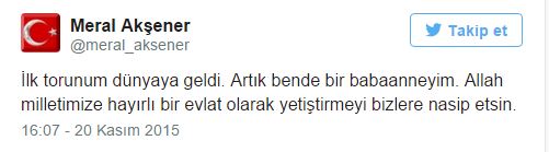 Akşener, mutluluğunu "İlk torunum dünyaya geldi. Artık ben de bir babaanneyim. Allah milletimize hayırlı bir evlat olarak yetiştirmeyi bizlere nasip etsin." diyerek takipçileriyle paylaştı.