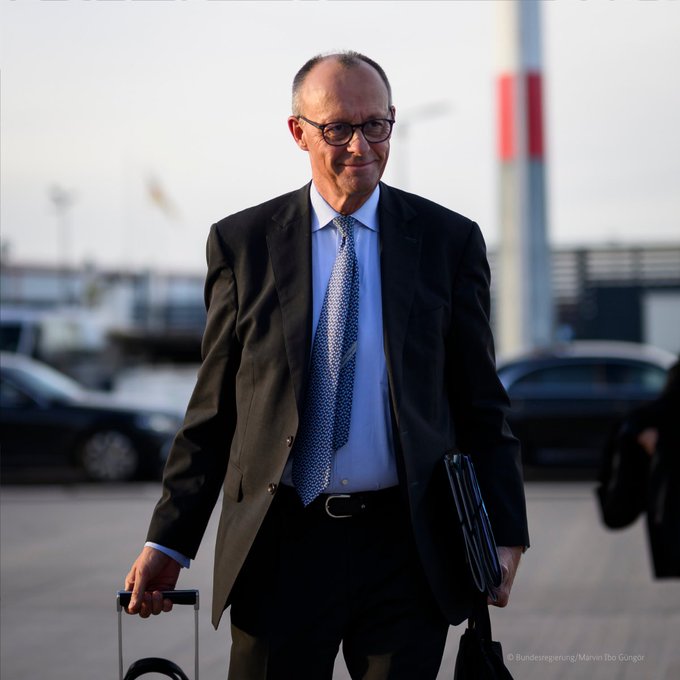 Görselde Merz, bir elinde evrak çantası diğer elinde tekerlekli bir valizle yürürken görülüyor.