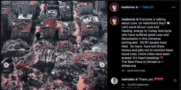 ABD'li ünlü pop yıldızı Madonna ise instagram hesabından yaptığı açıklamada "Herkes 14 Şubat Sevgililer Günü'nde aşktan bahsediyor. Gelin sevgimizi ve iyileştirici enerjimizi, depremlerde büyük kayıplar veren Türkiye ve Suriye'ye gönderelim" dedi.