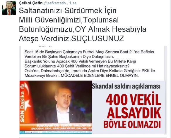 MHP Genel Başkan Yardımcısı Şefkat Çetin Twitter üzerinden yaptığı açıklamada "Saltanatınızı sürdürmek için Milli güvenliğimizi, toplumsal bütünlüğümüzü, oy almak hesabıyla ateşe verdiniz. Suçlusunuz" ifadelerini kullandı.