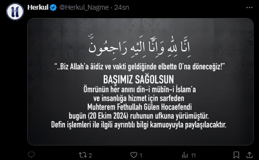 Muhterem Fethullah Gülen Hocaefendi'nin vefat haberi Herkul Nağme sosyal medya hesabından açıklandı. Açıklamada Hocaefendi'nin 20 Ekim 2024 tarihinde ruhunun ufkuna yürüdüğü ve defin işlemleriyle ilgili bilginin daha sonra paylaşılacağı belirtildi.