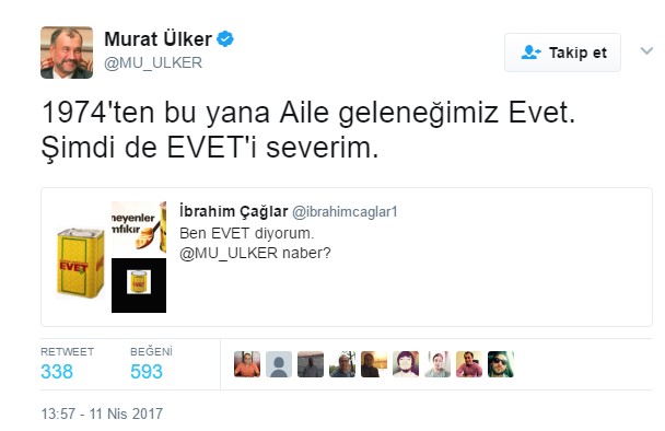 Murat Ülker, İTO Yönetim Kurulu Başkanı İbrahim Çağlar?'ın, Ülker grubunun ürettiği 'Evet yağ' kutusu ile 'Ben EVET diyorum. Murat Ülker naber?' notuna alıntılayarak cevap verdi. İşadamı mesajında, "1974'ten bu yana aile geleneğimiz Evet. Şimdi de EVET'i severim" ifadelerini kullandı.