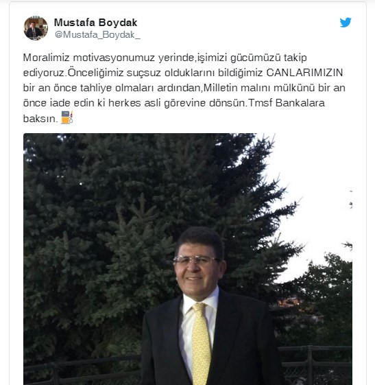 Tutuksuz yargılanan Mustafa Boydak el konulan şirketlerinin derhal sahiplerine iade edilmesi çağrısı yaparak sosyal medya hesabından şu mesajı paylaştı, ”Moralimiz motivasyonumuz yerinde, TMSF bankalara baksın”