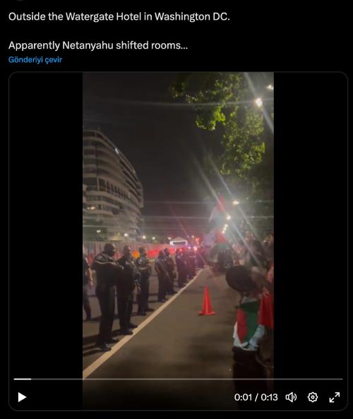 Sosyal medyaya yansıyan görüntülere göre, Netanyahu'nun ABD Kongresine hitap etmek için geldiği Washington'da otelinin önünde yüzlerce gösterici Netanyahu'yu ve İsrail yönetiminin Gazze'deki saldırılarını protesto etmek için toplandı.