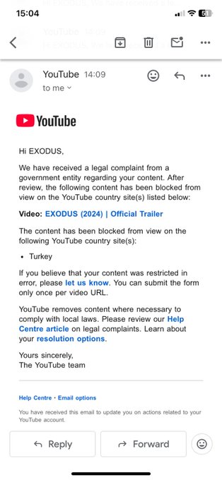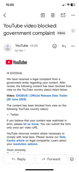 Türkiye'deki hak ihlallerini ve baskıları ekranlara aktaran Exodus (Göç) filminin fragmanlarına Türk hükümetinin talebiyle Youtube tarafından yasak getirildi.