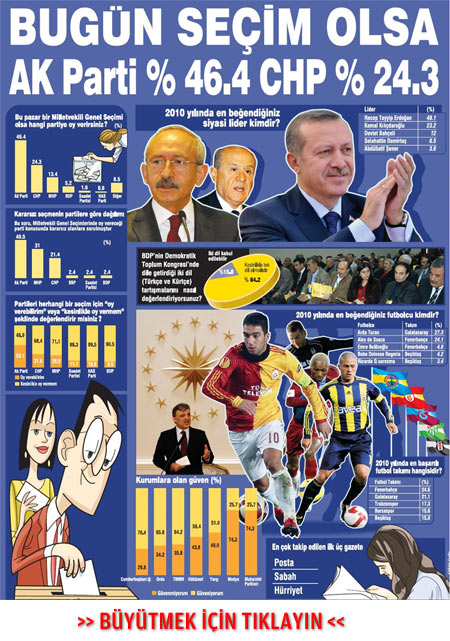 yüzde 46,4'ü "Bu pazar seçim olsa hangi partiye oy verirsiniz" sorusuna "AK Parti" yanıtını verdi. CHP'ye oy vereceklerini kaydedenlerin oranı yüzde 24.3 olurken MHP'nin oy oranı yüzde 13.4, BDP'nin yüzde 5.2, SP'nin yüzde 1.6, Has Parti'nin oy oranı ise yüzde 0.6'da kaldı. Araştırmada, "Seçime kadar partilerin oy yüzdelerinde bir kısım dalgalanmaların olabileceği söylenebilir. Ancak radikal değişimler olmazsa sıralamanın ve partilerin