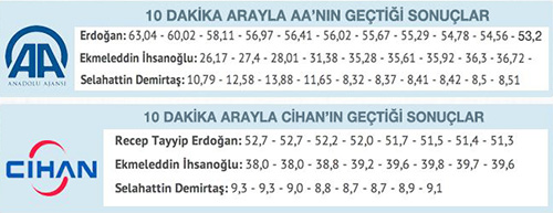 Seçim yasağı kalktıktan hemen sonra hükümet yandaşı televizyonlar tekrar AA'nın verilerine göre oranları açıklamaya başladı. Televizyonlar yüzde 57'lik bir oy oranıyla yayına başladı. Bu oran iki saat içinde yüzde 53'e sert bir şekilde düştü. Bu yayınlar AA'nın Erdoğan'ın fazla oy aldığı bölgeleri önceden vererek bir algı oluşturmaya çalıştığı şeklinde yorumlandı.
