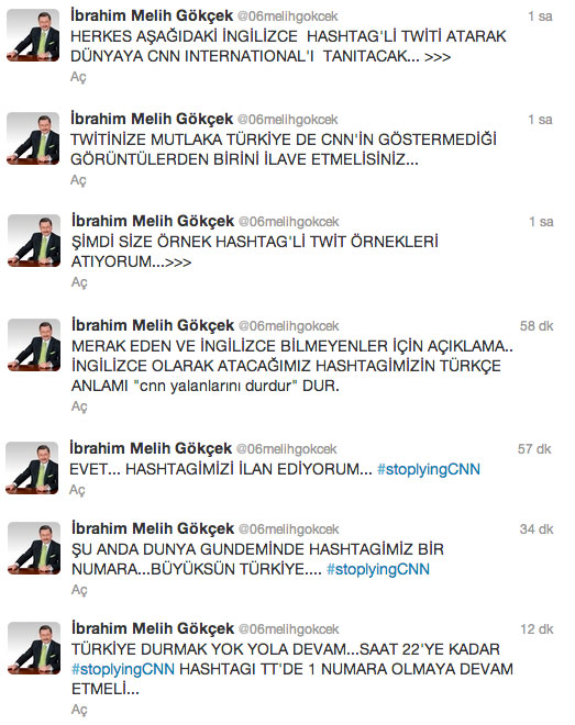 Gökçek Twitter'dan CNN'e karşı bir kampanya başlattı. Youtube'dan polisin Gezi olaylarında yaşadığı zor anların görüntülerini paylaşan Gökçek, bütün takipçilerinin #stoplyingcnn (yalan söylemeyi bırak CNN) hashtag'iyle bu görüntülerin linkini tweet atmasını istedi.