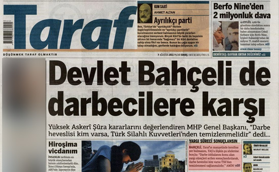 ''Bahçeli Taraf'ın manşetinde kendine yer bulmasını YAŞ'a ilişkin şu sözlerine borçlu: Darbe iddialarını konu alan yargı süreçleri acilen sonuçlandırılarak, darbe heveslisi kim varsa TSK'dan temizlenmesi sağlanmalıdır'' AMİN!'' ifadelerine yer verdi.