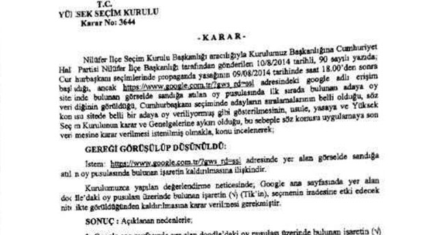 Bursa’da, Google+' class='textetiket' title='Google haberleri'>Google’nin cumhurbaşkanlığı seçimi için hazırladığı grafikte sandığa atılan oy pusulasında ilk sırada bulunan adaya oy verilmesine tepki göstererek, tasarımın kaldırılması için İlçe Seçim Kurulu’na başvuran CHP Nilüfer İlçe Başkanı Özgür Şahin'e cevap Yüksek Seçim Kurulu'ndan geldi.