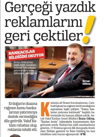 "Gerçeği yazdık reklamları geri çektiler" başlıklı haberde Vakıfbank Genel Müdürü İkram Göktaş'ı hedef almıştı.